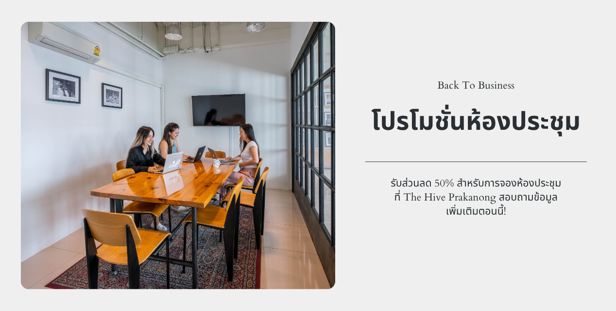 รับส่วนลด 50% สำหรับการจองห้องประชุมที่ The Hive Prakanong สอบถามข้อมูลเพิ่มเติมตอนนี้!