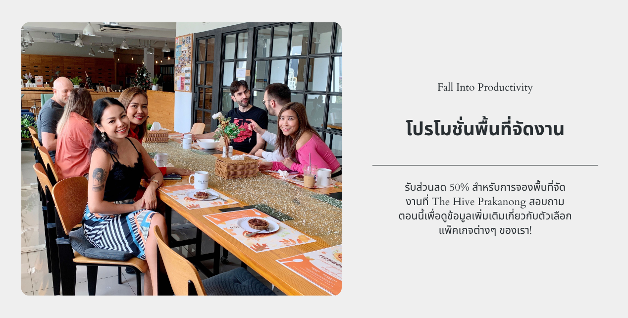 รับส่วนลด 50% สำหรับการจองพื้นที่จัดงานที่ The Hive Prakanong สอบถามข้อมูลเพิ่มเติมเกี่ยวกับแพ็คเกจของเราได้เลย!